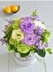 涼やかな季節の花々を組み合わせ、見た目も気分も爽やかになる夏のアレンジ。お部屋にひと足早く、清涼感を届けます。