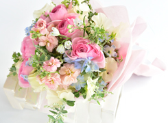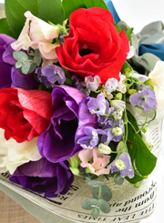 *ふわふわとしたラナンキュラスとスイートピーの花束。春を感じさせるとても可愛いらしい花束です。