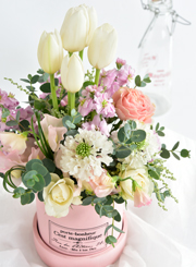 チューリップとスイートピーのアレンジメント。つぼみから開いていく様子をお楽しみください。 \5,500