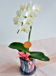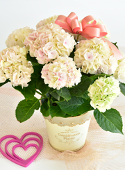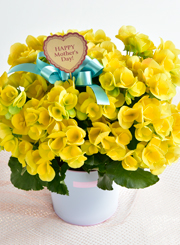 花言葉は‘幸せがやってくる‘。明るい器にあしらってお届けします。