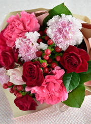 母の日にぴったりなピンクと赤系の可愛らしいブーケです。