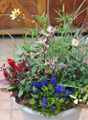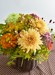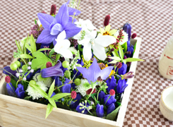 キキョウやリンドウ、ワレモコウなど、秋を代表する草花を詰め込んだ和風のアレンジメントです。