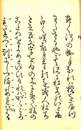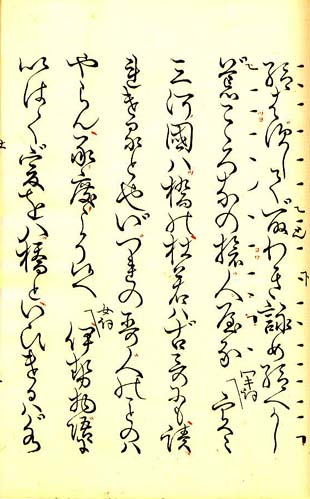 | (前略) 伊勢物語りにいわく 三河の国八橋といひけるはふ所 に至りぬ ここを八橋とは |